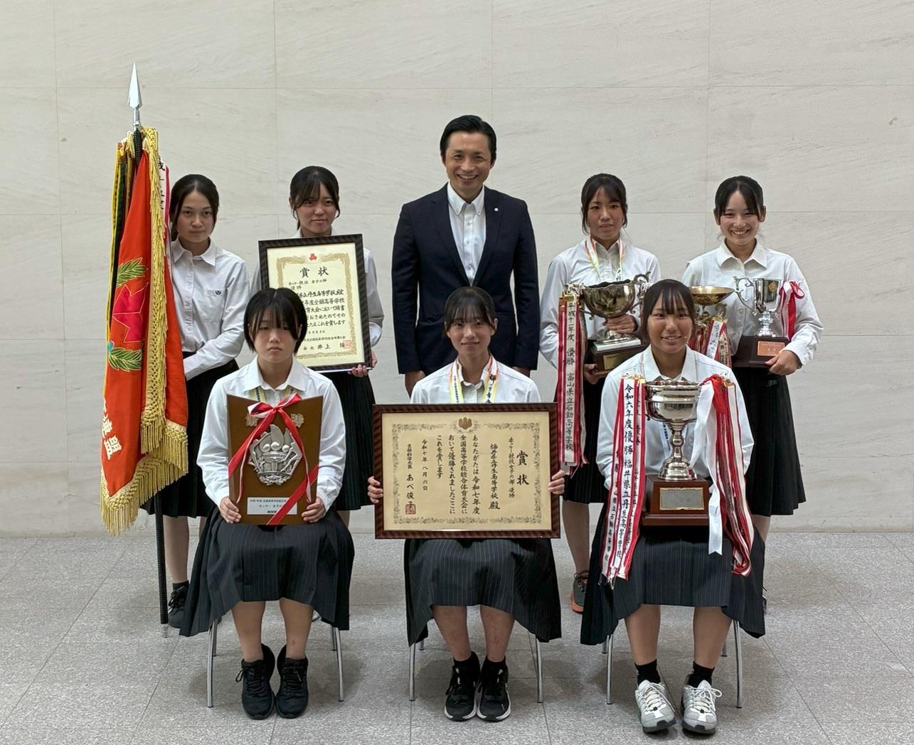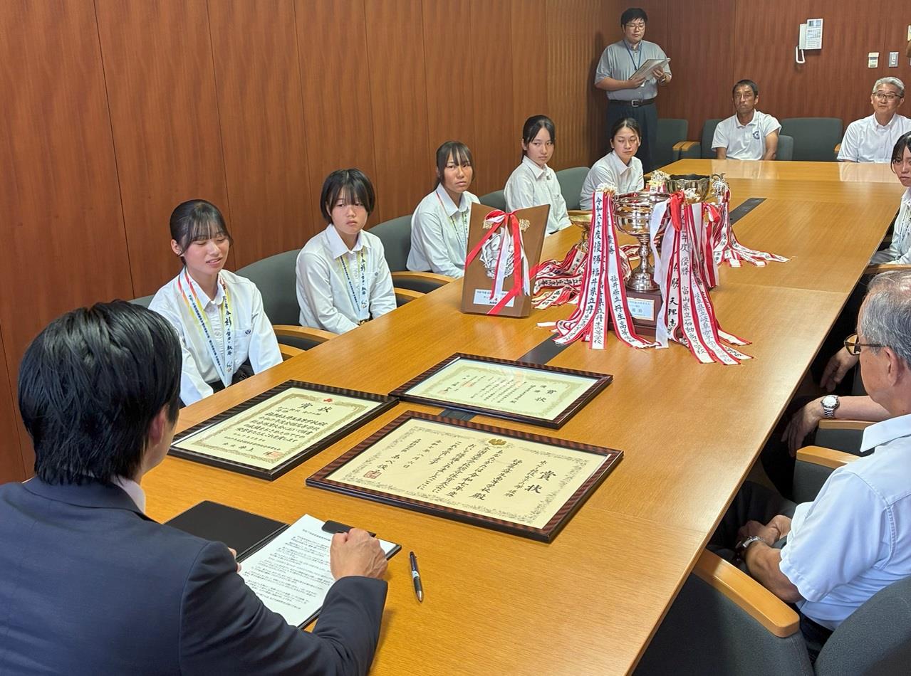 令和7年度全国高等学校総合体育大会において優勝を収めた丹生高校女子ホッケー部の皆様が、町長に優勝報告に来られました。心よりお祝い申し上げます。