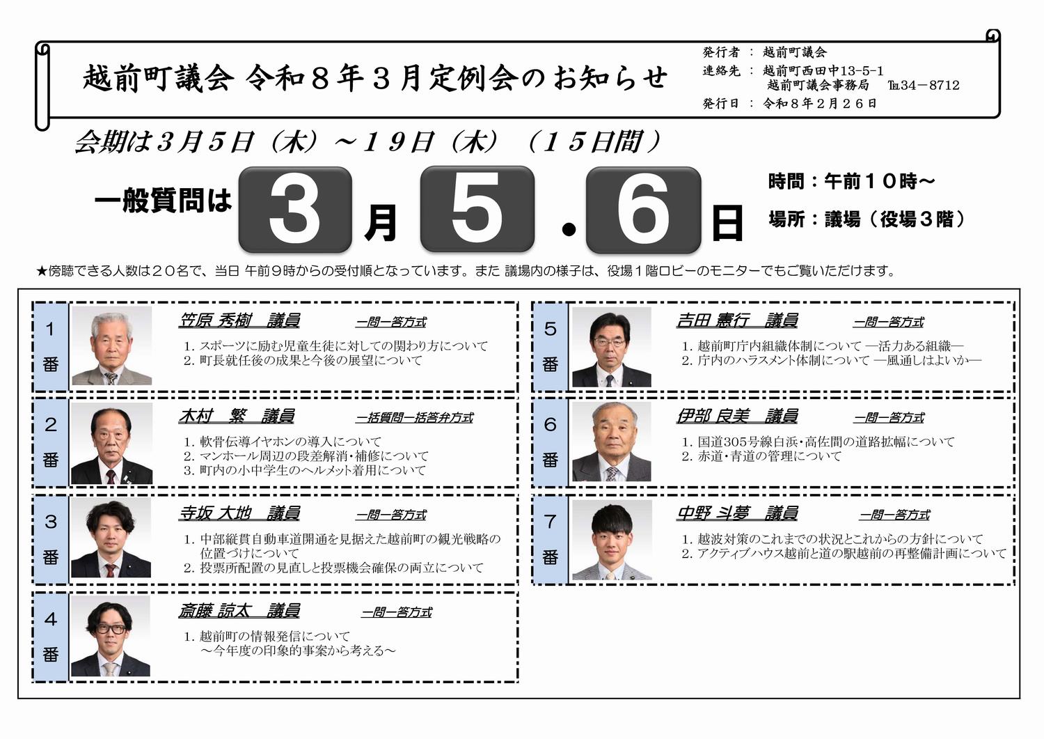 令和8年3月定例会の日程、定例会に提出される予定の議案一覧と一般質問のテーマを掲載しています。