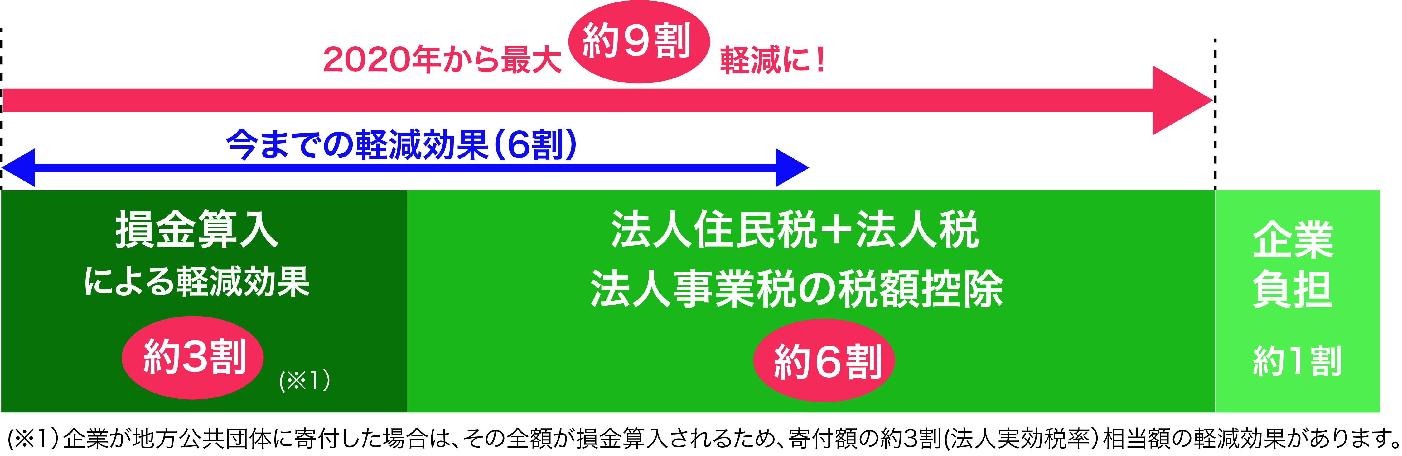 地方創生のさらなる充実・強化に向けて、地方への資金の流れを飛躍的に高める観点から、2020年度税制改正により制度が大幅に見直されました。これにより、税額控除により最大で寄附額の9割が軽減され、実質的な企業の負担が約1割まで圧縮されるなど、より使い易い仕組みとななったことで、企業は積極的に社会貢献(CSR)活動に取り組むことができるようになりました。