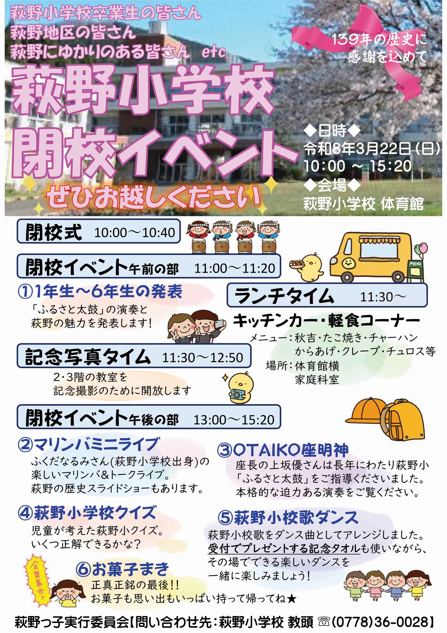 つきましては、下記の日程で閉校式と閉校イベントを開催いたしますので、保護者・卒業生・地域のみなさまは、ぜひご参加ください。